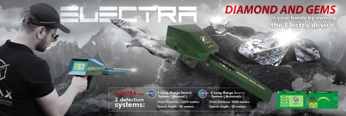 • L’appareil Electra fonctionne sur des systèmes scientifiques et des technologies avancées avec des performances de haut niveau pour détecter les diamants et les pierres précieuses sous terre à des profondeurs allant jusqu’à 100 mètres en utilisant les systèmes de recherche modernes fournis, ce qui donne à l’utilisateur une interface de recherche complète et un suivi précis de l’emplacement et de la piste de la cible .