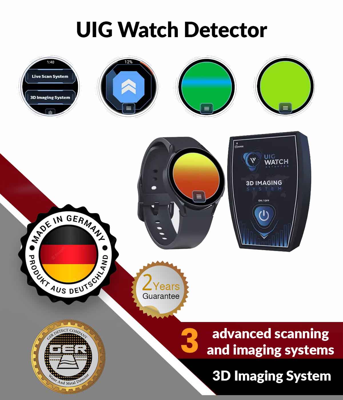 يعمل جهاز UIG Watch على تنفيذ عمليات التنقيب والبحث عن المعادن الثمينة والكنوز والدفائن الأثرية والدهاليز والممرات والكهوف والفراغات في باطن الارض بكل سهولة بالإضافة لإجراء عمليات مسح دقيقة للجدران القديمة والأثرية والوصول الى أعماق حتى 20 مترا في باطن الأرض، مع امكانية تحديد العمق بالمتر والسنتيمتر وقدرته على التمييز بين المعادن والفراغات بدقة عالية.